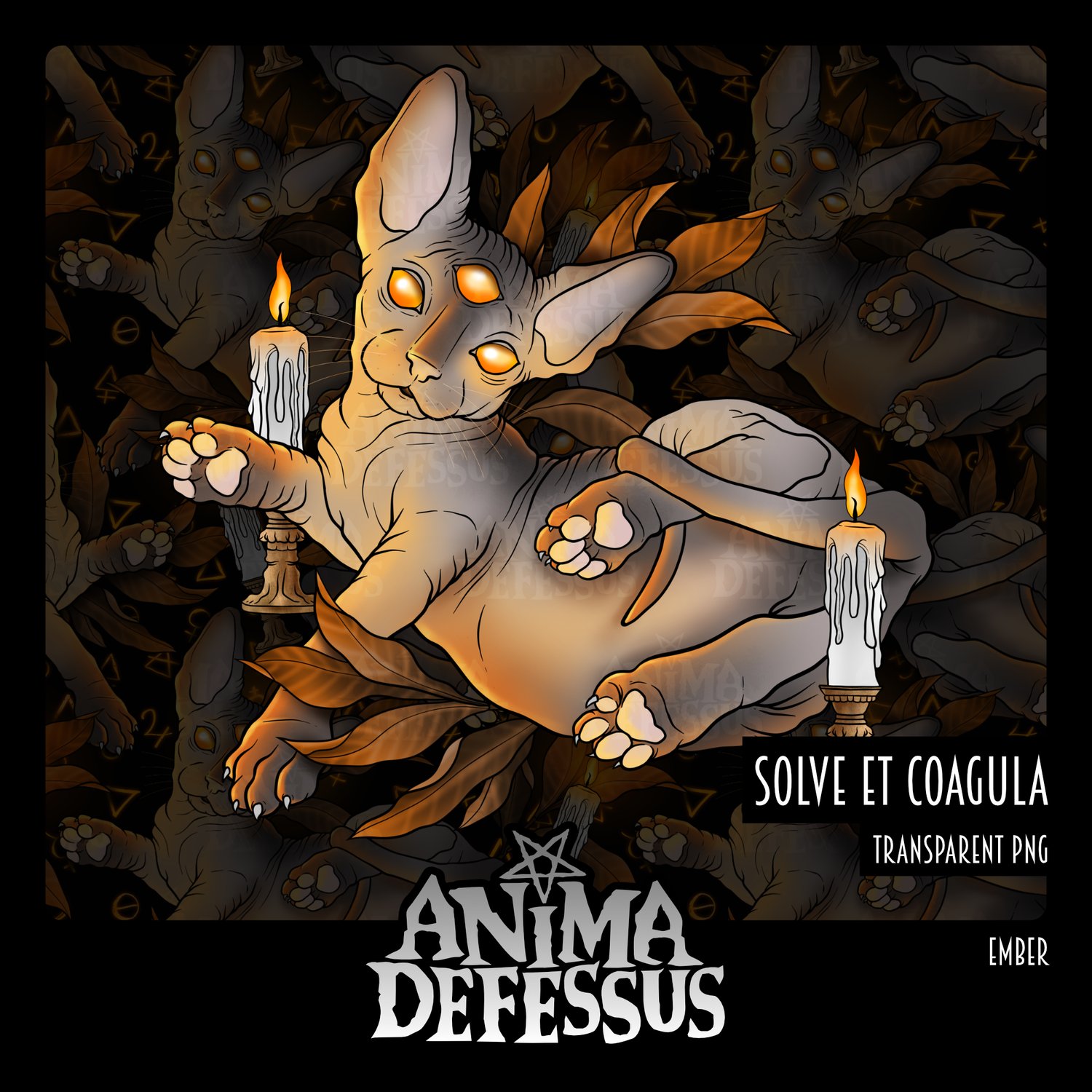 Solve Et Coagula, dissolve and coagulate. Seemed like a fitting name for a design featuring alchemical symbols, flames and sphynx kittens with third eyes. The saying symbolizes transformation, purification and rebirth after all. This is one of five colorways, check out the rest of the collection for more options! (Yes, there is a goat design with the same name on the site, but that’s fine)